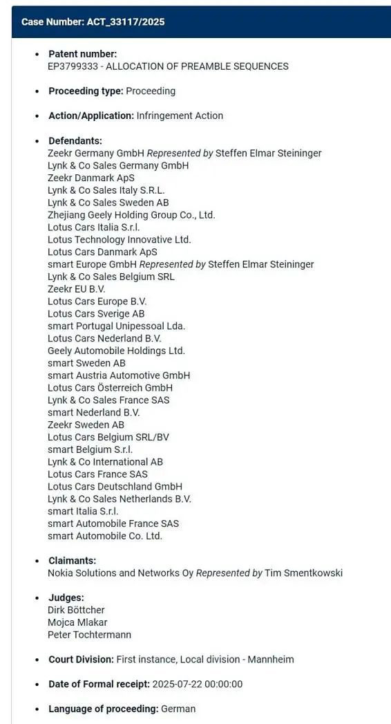 日前,据外媒报道,诺基亚已经对吉利集团及其旗下四个子品牌极氪、领克、路特斯和Smart发起了专利侵权诉讼,这次诉讼涉及吉利集团在欧洲18个国家的23家分公司。此次专利诉讼,核心“标的”是蜂窝通信领域的标准必要专利,诉讼理由是蜂窝技术在车辆中的应用,没有获得诺基亚的授权。