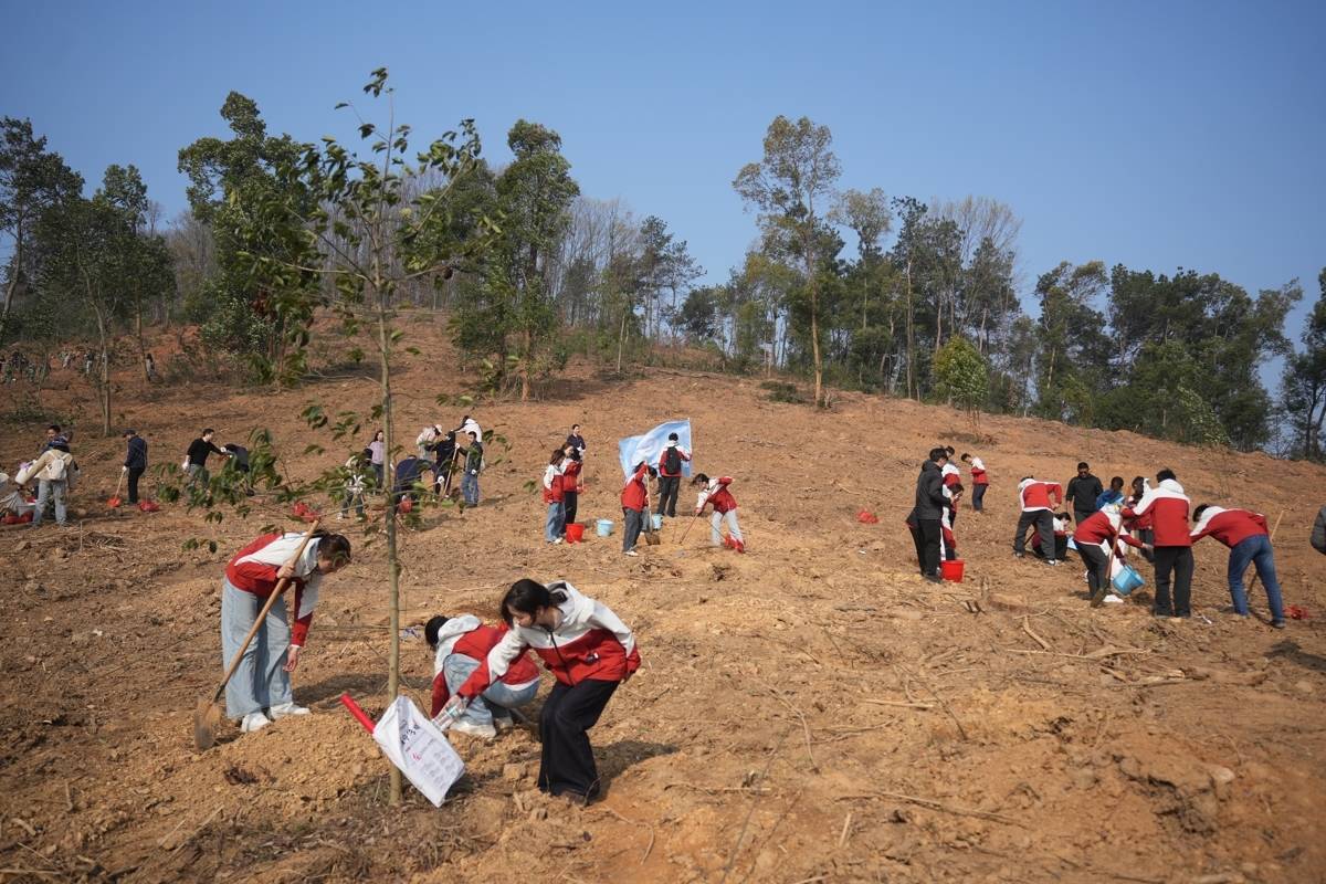 3月12日,在蔡甸区嵩阳林场的“武汉森宝公益林”植树活动现场,来自多家团体单位的代表及市民挥锹培土,共同种下枫香、乌桕、青冈、桢楠等树苗6000株,其中包括全国网友通过云端尽责捐种的树苗。