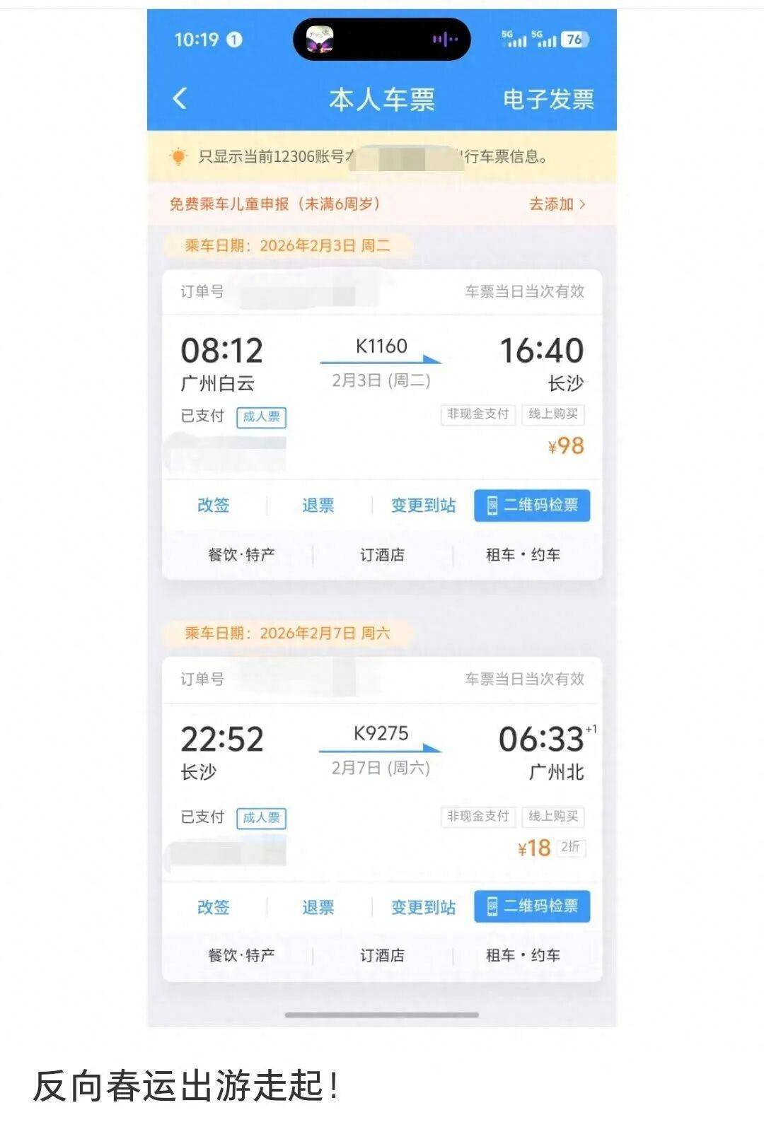 陈女士所购往返车票。图/社交平台截图购票平台显示,陈女士的回程车次为K9275,22时52分于长沙站发车,次日6时33分抵达广州北站,车程为7小时41分。其购买的硬座票享2折优惠。陈女士感慨:“我本来就有春节前出行的打算,注意到票价后马上就买了,从没有买过这么便宜的票。我能接受这么长时间的硬座,以前还坐过更长时间的。”前两年,陈女士就有购买特价票出游的经历。其介绍,往年从广州发车时,列车上人比较多,回程时人很少,一人能享受整排座位。她表示会向朋友推荐反向春运。据三湘都市报此前报道,广铁集团客运部工作人员介绍,春运火车票打折主要是对部分非紧张时段、方向的旅客列车实行优惠票价。近年来,铁路不断扩大市场化定价的适用范围,让火车票由原来的固定、单一票价机制优来源:九派新闻举报/反馈