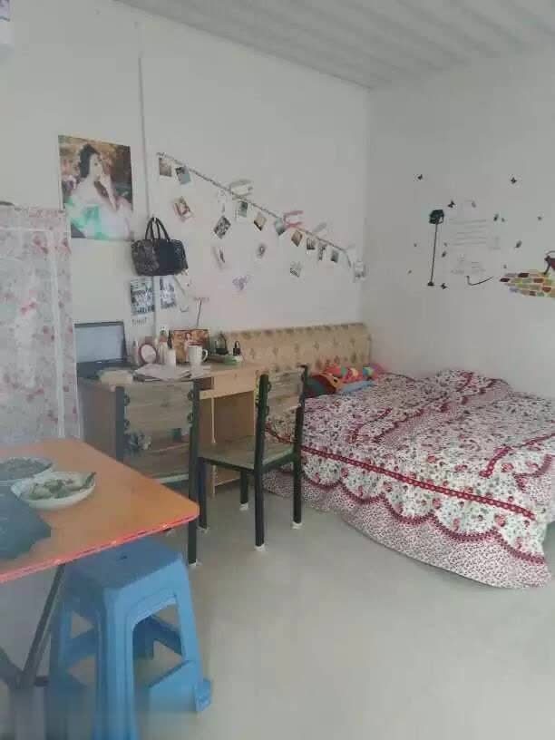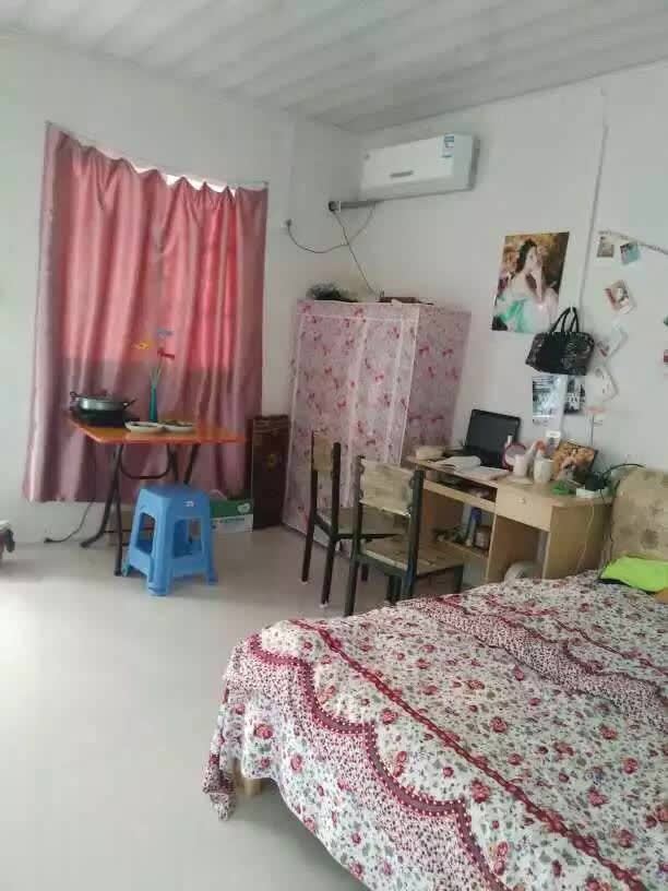这是一个带厨房、阳台的单间。卧室既是睡眠空间,又充当餐厅。床旁是张小书桌,书桌旁摆放着简易衣柜,窗边放置小桌子作为餐桌。虽是租房,我每日都将其打扫得一尘不染,尽力为女儿营造一个干净、温馨的家!夏天天气炎热,向来节俭的老公买了一台空调,他说不能让女儿受委屈!