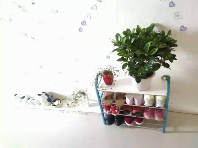 网上买的鞋架,仅花了15块,哈哈!鞋架上还摆着盆栽,让我们的小窝更添温馨!