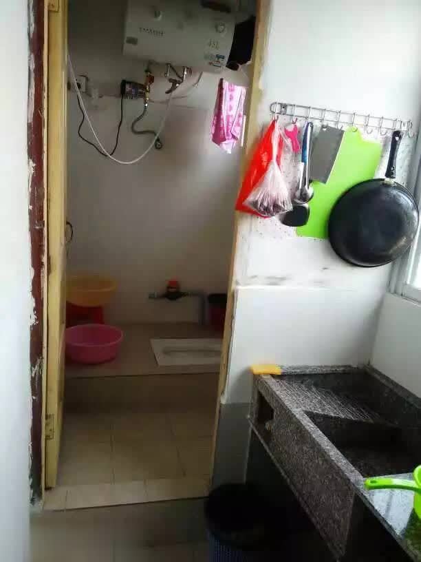 从门口望进去,外面是卧室,里面是厨房,卧室与厨房之间拉了帘子作为隔断,如此油烟就不会窜到卧室了!
